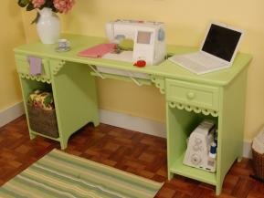 Olivia features a 2-position mechanism that will move your sewing machine into the flatbed and freearm positions. Pull the quick release lever forward to make your sewing well become flush with the top and use Olivia as a desk or another hobby table. You'll find plenty of storage for your small notions with 2 drawers and 2 deep cubbies for storage of your sewing machine, serger or baskets of fabric. Olivia's wide table top surface allows you to sit center needle comfortably and have plenty of space both on the left and right side of your sewing machine. Olivia has a durable design with composite construction and a vinyl laminate that should last for a lifetime of sewing projects. Olivia comes in a fun vibrant pistachio green or a clean crisp white laminate. She will arrive in 2 separate boxes needing a hammer, a screwdriver and about 1 hours worth of time to assemble. Need help? Call our toll free number for assitance. Cabinet Dimensions: 64" wide x 19 3/4" deep x 30" tall Will accommodate sewing machines no larger then: 9 1/2" front to back (deep) x 18 1/2" left to right (wide)