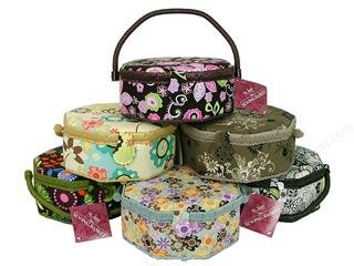The St Jane Sewing Basket Collection includes a variety of different shaped baskets in beautiful, decorative fabrics. They are lined in coordinating fabrics and include a lift-out tray for small items, attached pin cushion and pocket on lid. Bring style and fashion to any sewing room with these beautiful baskets. 9" Octagon Assorted- Octagon sewing baskets that are covered in a variety of different brightly colored floral print fabrics. Each basket has a magnetic snap closure on the front and is approximately 9"x 9"x 4" with a touch of wicker-the handles and trim. They are approximately 3" deep inside.