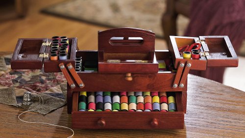 Set comes complete with the essentials: tape measure, thimble, 20 buttons, 5 pants buttons, 98 straight pins, 20 safety pins, 20 needles, needle threader, 52 spools of thread and scissors. Wooden box has a carrying handle on top for easy portability. 8"L x 5 1/4"W x 6"H....
