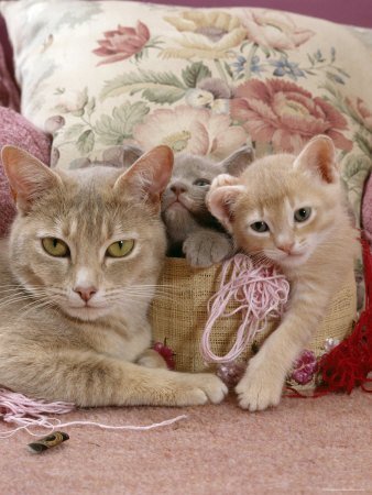 - Premium Poster Title: 6-Week, Blue and Cream Kittens with Lilac Tortoiseshell Mother, Playing in Sewing Basket